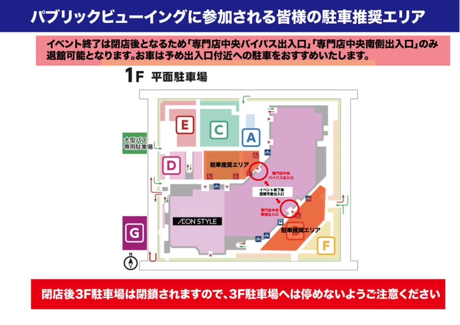 なお、閉店時間で3F駐車場は閉鎖されますので、パブリックビューイングに参加される方は3F駐車場には駐車されないようご注意ください。お車を出すことができなくなります。