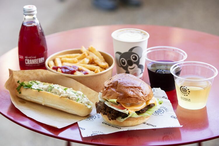 食事関係も評判がいい。左下が「クロコダイルロール」。使われているのはワニの尾の肉とのこと。まったくクセがない爽やかなテイスト。その隣がビーフブリスケットバーガー。フレンチフライは万博内のフレンチフライのなかでも好評価の常連。奥の紙コップに入っているのはフラットホワイトというエスプレッソにスチームミルクを注いだオーストラリア発祥のコーヒー。右はシャルドネの白ワインとオーストラリアを代表するブドウ、シラーズの赤ワイン。万博内の食事としては価格が程よいのも魅力のひとつ。2021年、オーストラリア・プロフェッショナル・シェフ・オブ・ザ・イヤーに選ばれたアンドリュー・バラードがエグゼクティブシェフとして監修している