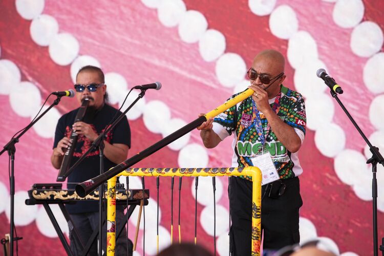 これは私の世代的な感覚を多く含んだ表現だけれど、かつてロンドンを中心に流行したブレイクビーツ、特にビッグビートの匂いを感じるノンジャンル気味の音楽は、10月になってもまだ夏の匂いを感じる開放的なパビリオン前のステージでは、クラブカルチャーというよりラウンジミュージック的なテイストを帯びて爽快だ。合間に入るオーストラリア文化の伝統と交流を熱っぽく、しかし説教臭くなく語るチュプルのMCも巧みで、もはやここが日本の大阪の万博会場であるというリアリティはすっかりなくして、私はいま世界のどこか遠くに来ているのだ、という気持ちになっていた。