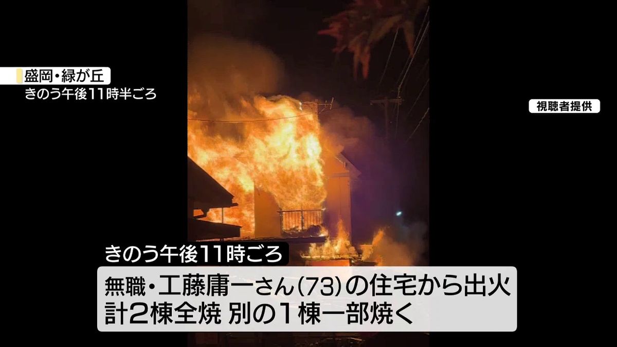 13日午後11時ごろ、盛岡市緑が丘の無職・工藤庸一さん73歳の家から火が出て、二階建ての住宅およそ70平方メートルと隣の住宅のあわせて2棟を全焼したほか、別の住宅の一部を焼きました。