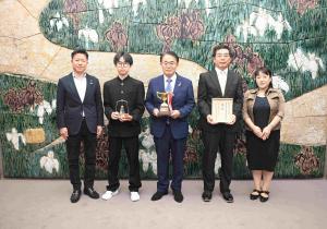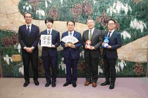 また、対局会場のポートメッセなごやは、来年開催の「アジア・アジアパラ競技大会」の会場の一つであることから、今日は、JT杯とアジア・アジアパラ競技大会がともに大いに盛り上がる期待を込めて、私から、アジア・アジアパラ競技大会の公式マスコット「ホノホン」と「ウズミン」を贈呈しました。