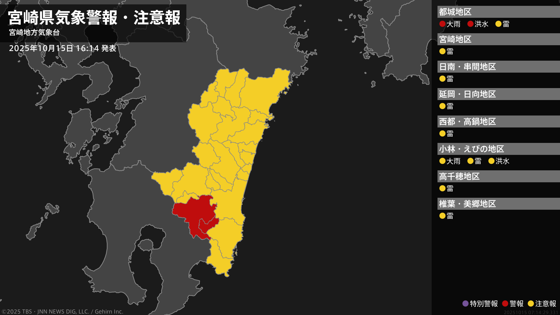 【洪水警報】宮崎県・都城市、三股町に発表 15日16:14時点