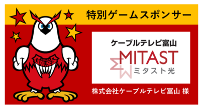 ケーブルテレビ富山「Cue!スタジオ」のMCを務める、さだありさ様と新庄結衣様、ケーブルテレビのマスコットキャラクター ミタスト君が来場され、ハーフタイムには番組の耳寄り情報をお届けします!(※写真は2024-25シーズン)