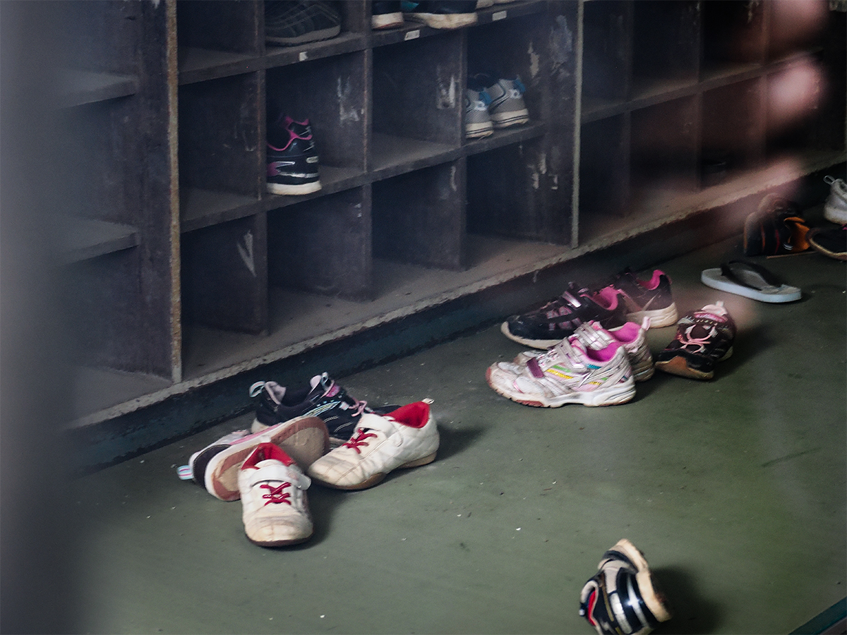小学校の靴箱周辺には当時のまま靴が散乱している。(安田菜津紀撮影)
