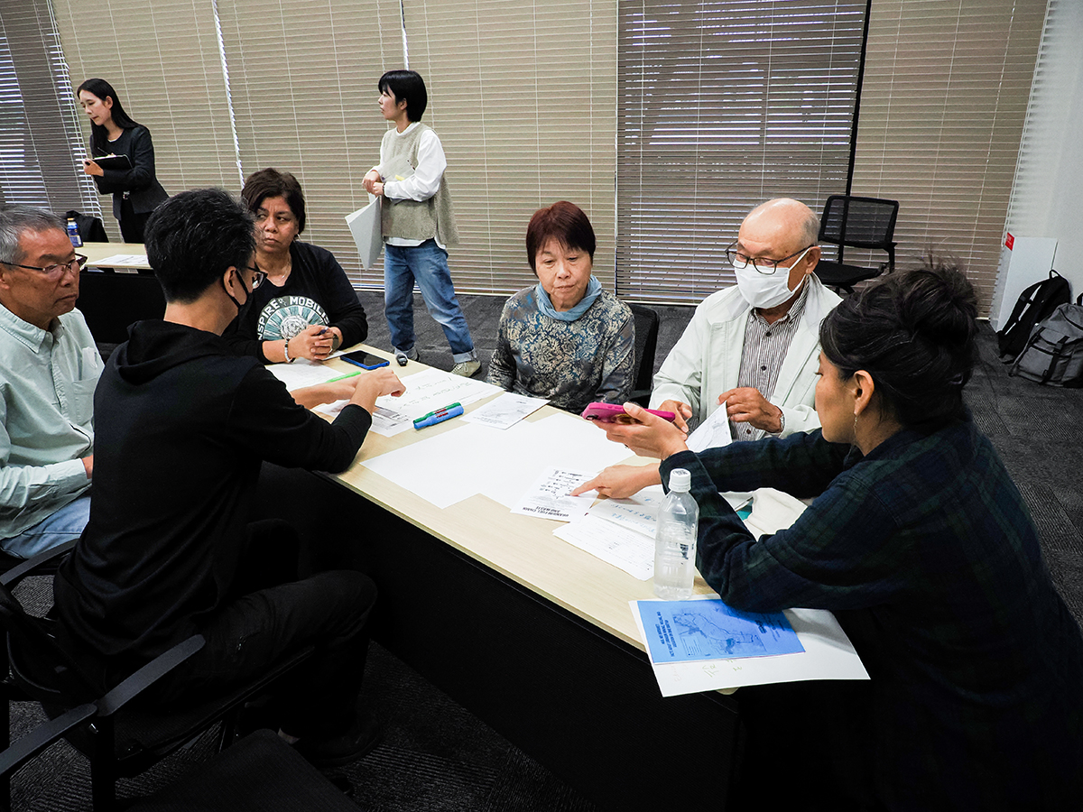 チームに分かれて議論を深める参加者たち。右端は自身の経験を伝えるレオナ・モーガンさん。(安田菜津紀撮影)