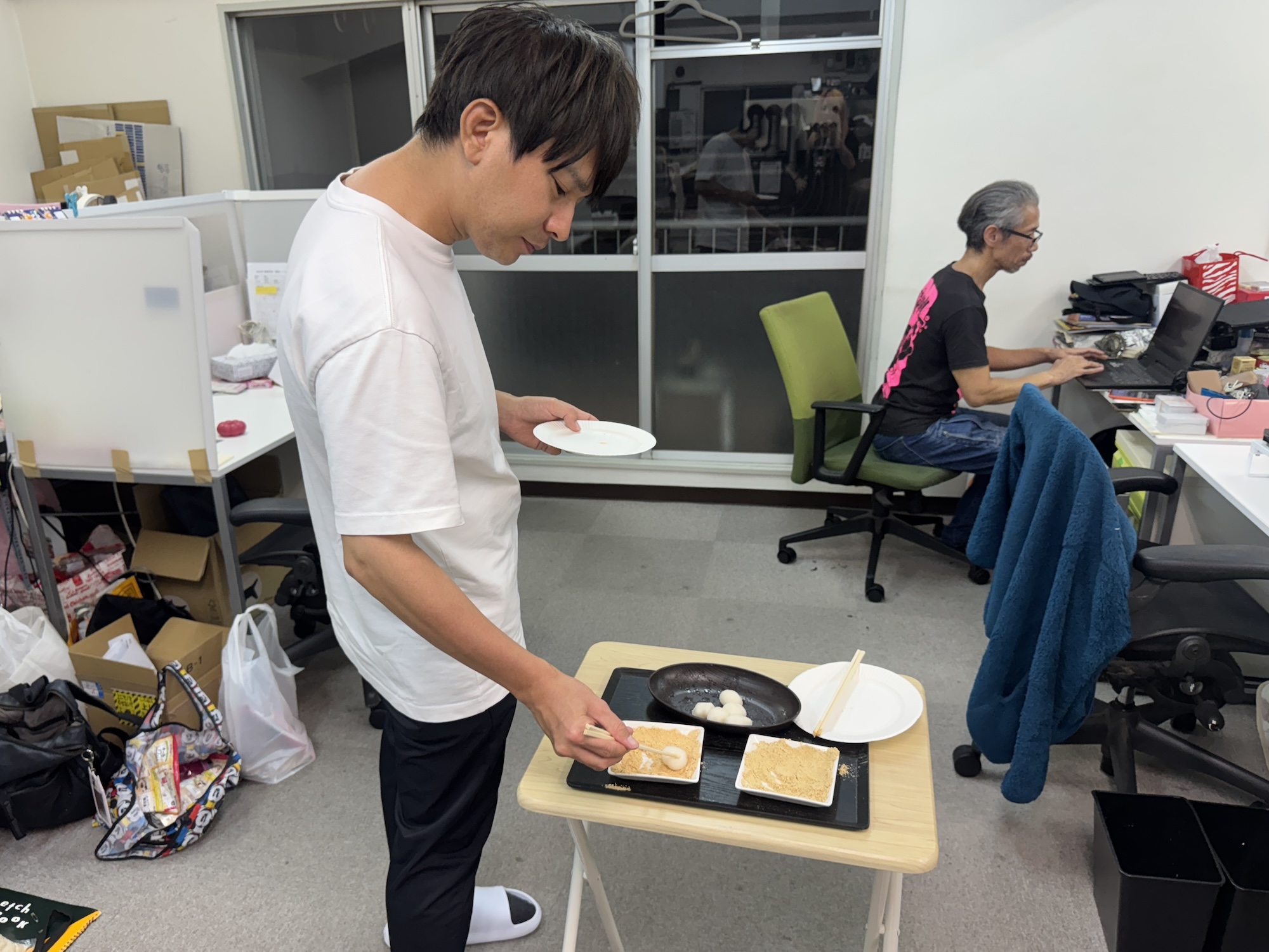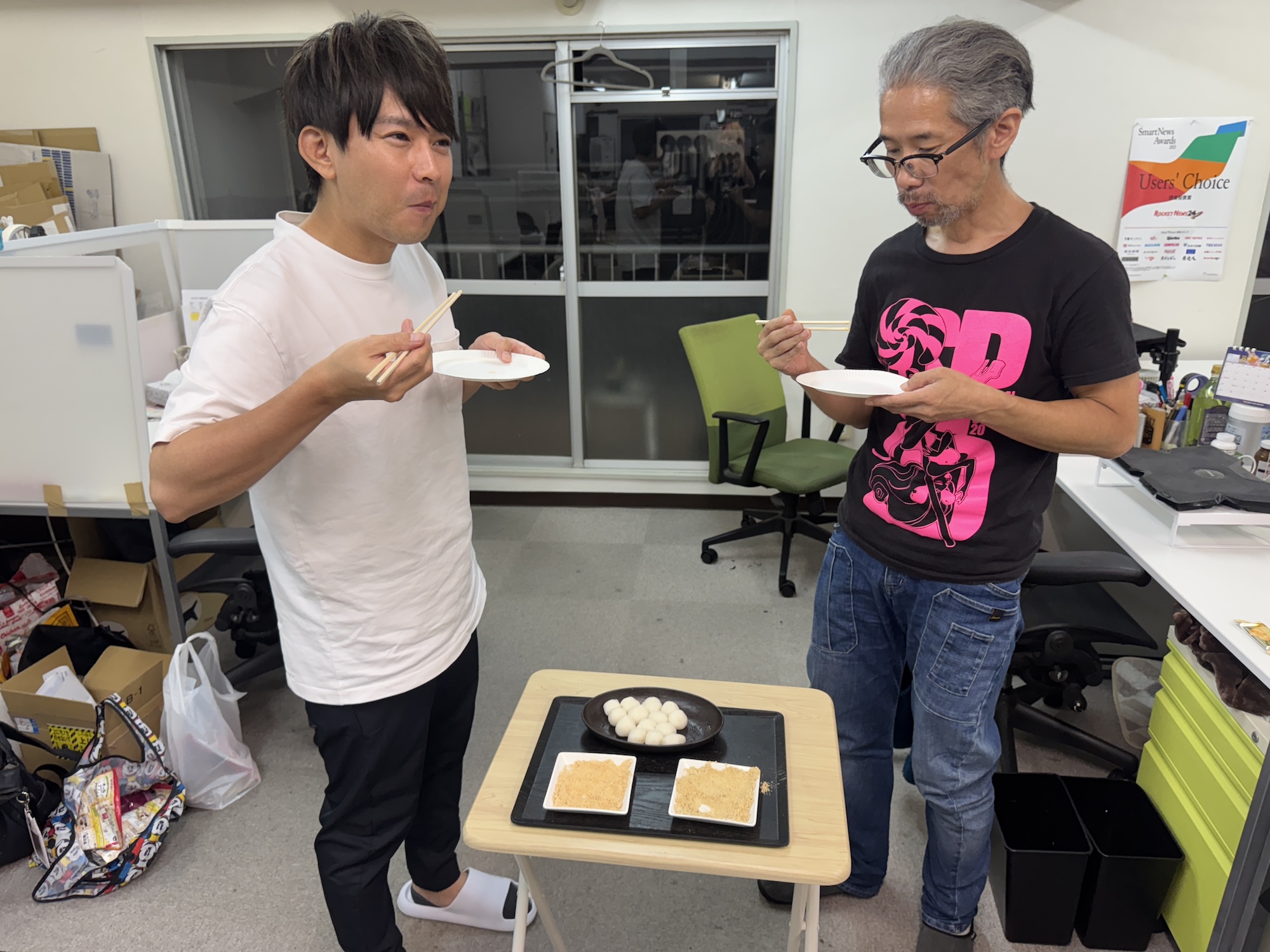そんなナンメの青豆粉と白きなこを、ナンメ経験者の佐藤記者と初見の古沢くんに比較してもらおう。