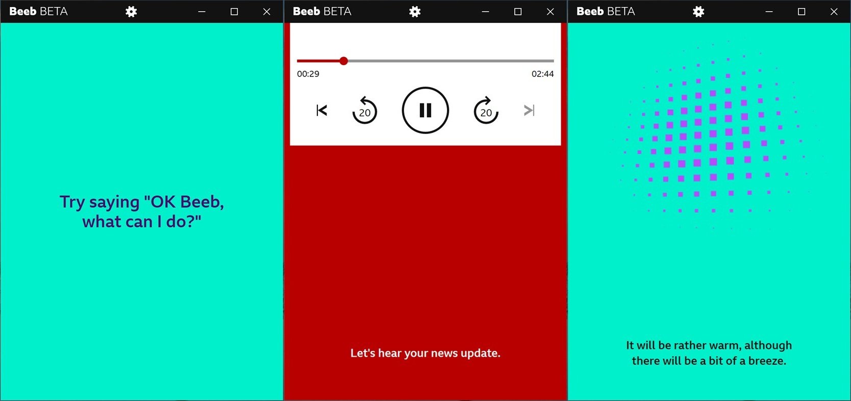 例えば、ユーザーはBBCのラジオコンテンツやポッドキャスト番組を再生するようにBeebデジタルアシスタントサービスに頼むことができます。さらに、次の天気予報を説明したり、ジョークを言ったりするように頼むこともできますが、コンテンツはBBCのサービスによって提供されます。