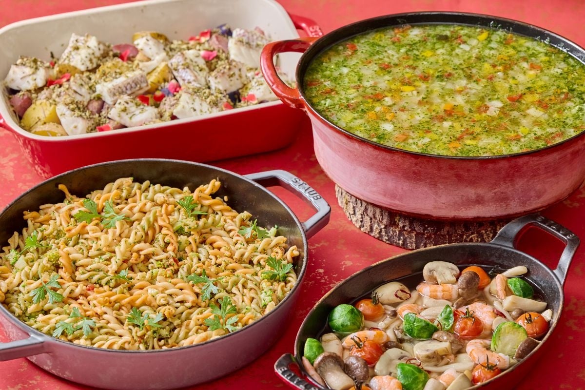 クリスマスカラーのパスタ/白身魚とカラフルじゃが芋の香草パン粉焼き/海老とキノコのアヒージョ バゲット添え/冬野菜のピストゥスープ