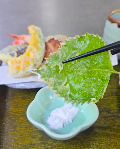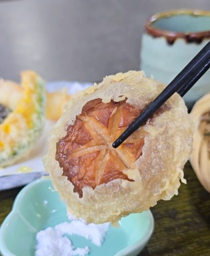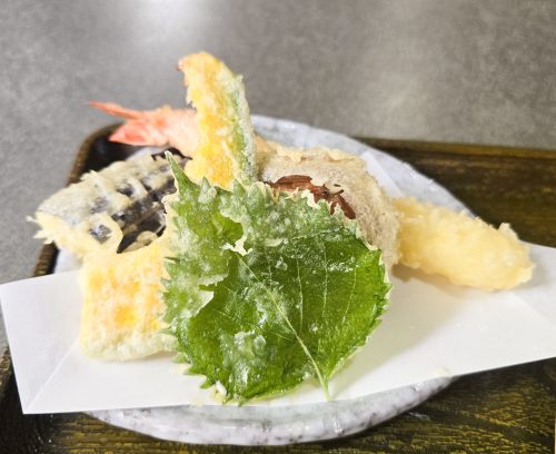天ぷらは揚げたてで、シイタケ、カボチャ、エビ、大葉、なすびの5種類を提供しています。