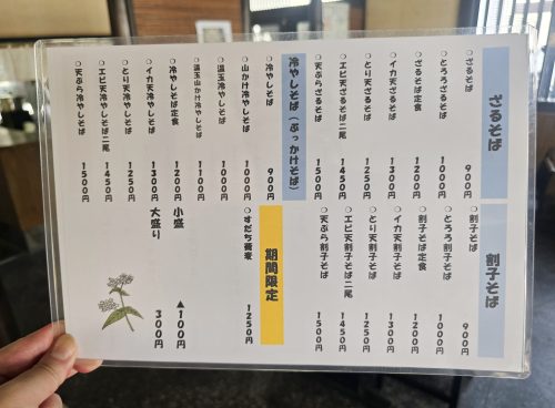 移転前からの定番「ざるそば」「割子そば」に加え、新メニュー「冷やしそば(ぶっかけそば)」が登場。