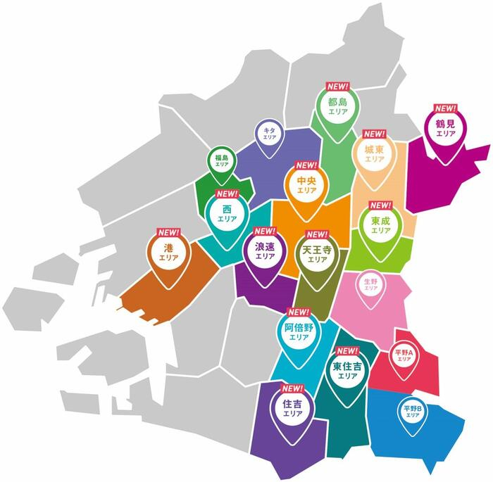 今回追加するのは都島、中央、西、港、天王寺、浪速、東成、城東、鶴見、阿倍野、住吉、東住吉の12エリア。既存のキタ、福島、生野、平野A、平野Bとあわせて全17エリアでの運行になる。森之宮、西・港の2エリアは10月27日限りで廃止とし、翌日から新しいエリア区分に切り替える。