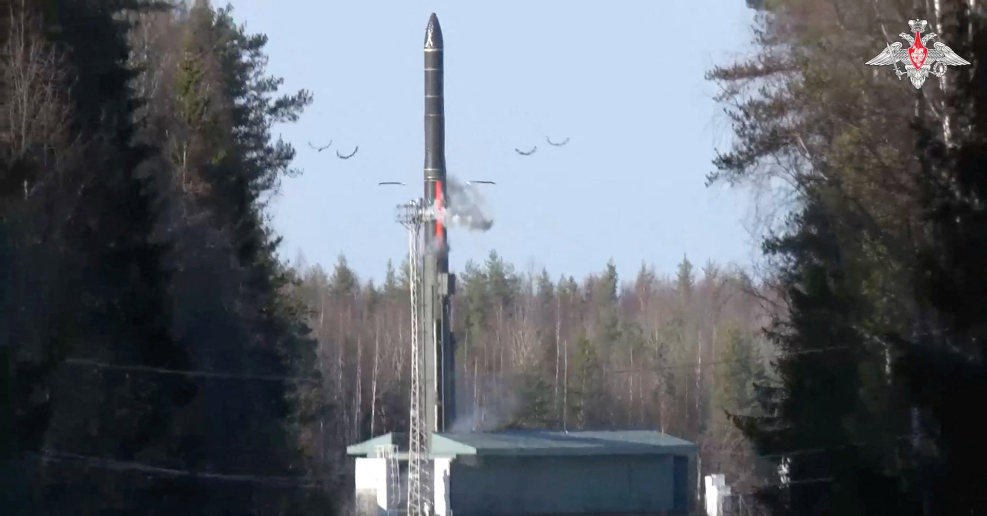 ロシアのプーチン大統領は22日、同国の核戦力の即応態勢および指揮系統を確認するため、陸・海・空による核戦力の試験を視察した。写真はプレセツク宇宙基地から大陸間弾道ミサイル(ICBM)「ヤルス」が発射される様子。アルハンゲリスク州で同日撮影(2025年 ロイター/Russian Defence Ministry/Handout via REUTERS)