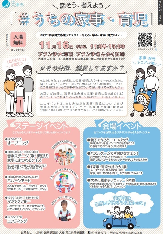 子育て世代を対象に、歌、クイズ、マジック等エンターテイメントを楽しみながら、学び、交流するイベント「おおつ家事育児応援フェスタ 2025〜話そう、考えよう「#うちの家事・育児」〜」が11月16日(日)11:00〜滋賀県大津市のブランチ大津京 三角ひろばにて開催されます。ステージショーやブースなどを通して親子や夫婦で「家事・育児」について学べる体験型イベントの内容をご紹介します。