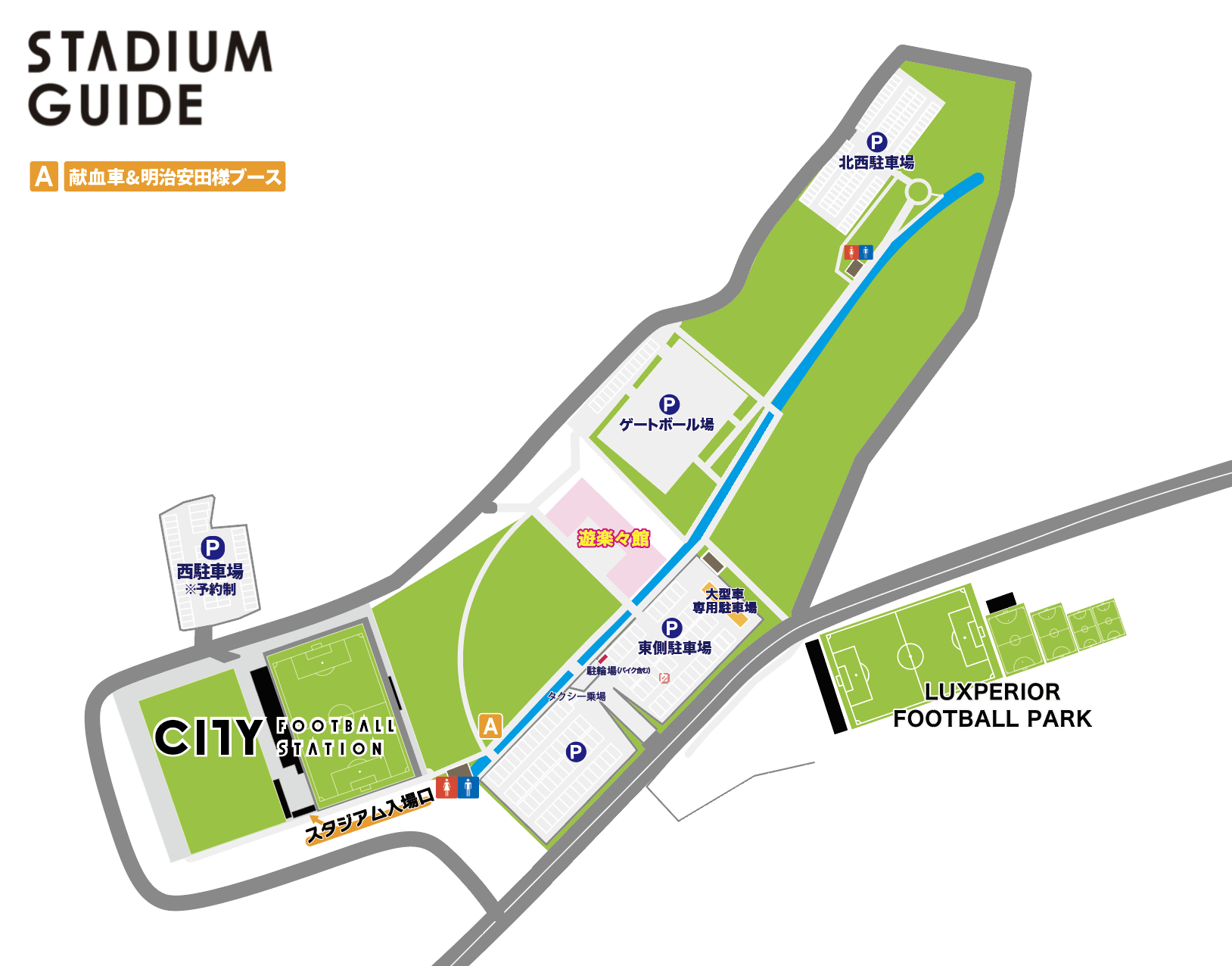 ※LUXPERIOR FOOTBALL PARK駐車場から遊楽々館の駐車場まで車道を歩いての通行は大変危険ですので、上記の地図の道を通りCFSの方へお越しください。
