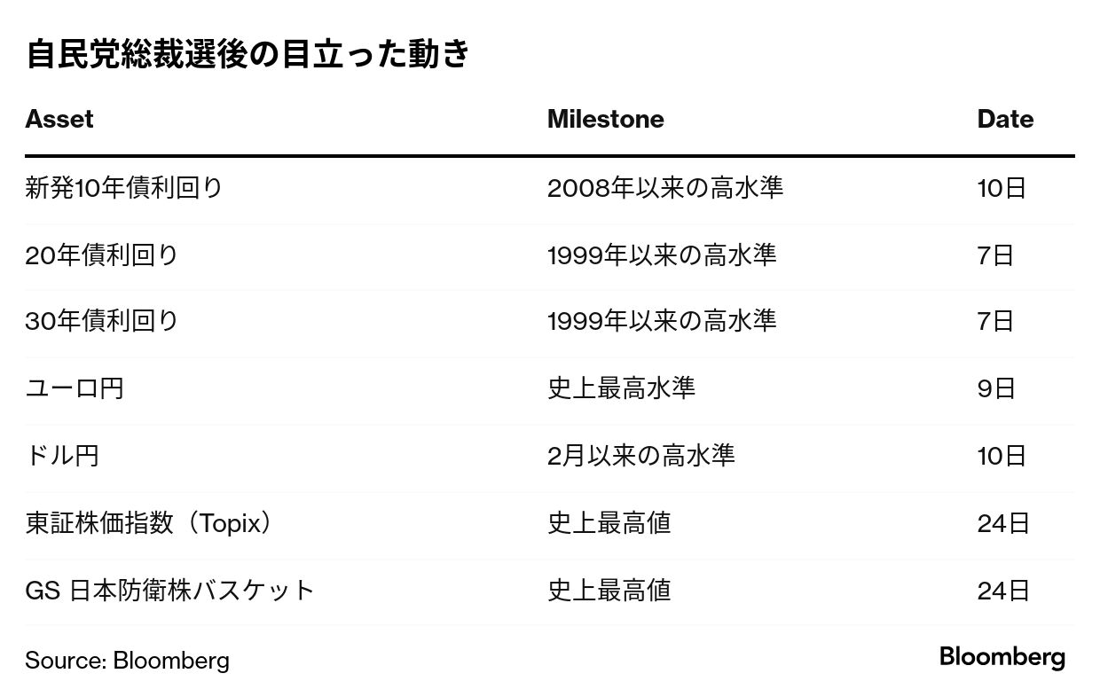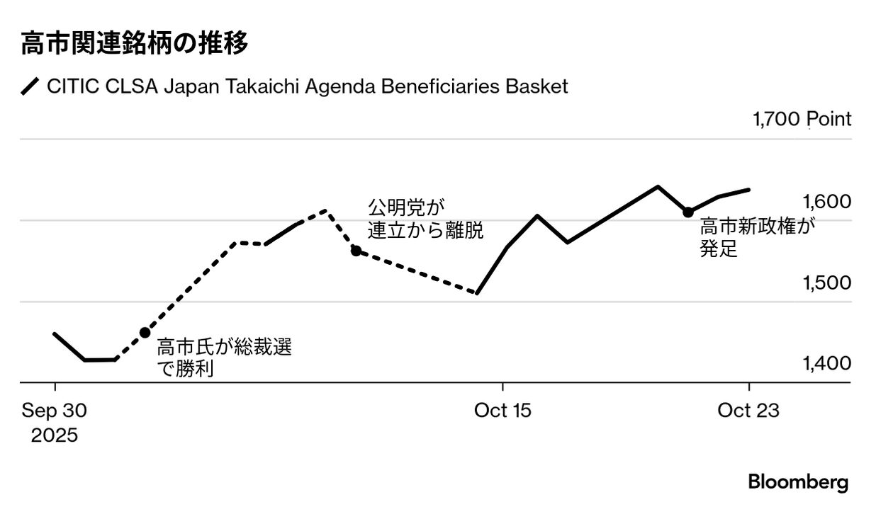 一方、高市新政権による財政拡大の可能性を警戒し、債券市場では30年国債利回りが過去最高水準まで上昇。外国為替市場の円相場は対ドルで8カ月ぶりの安値へ下落した。高市氏は総裁選中に物価高対策の財源を巡り、必要なら赤字国債の発行も辞さない考えを示していた。