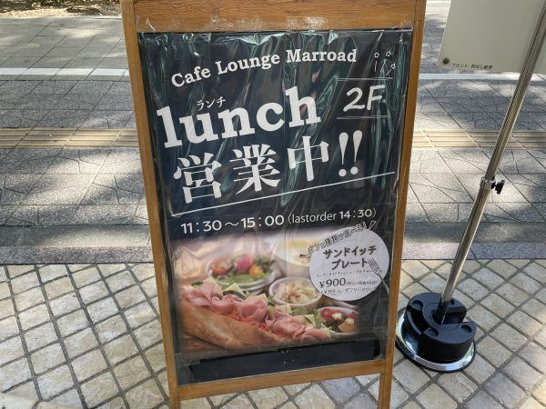 「Cafe Lounge Marroad」の営業は平日のみ。ランチはサンドイッチプレートAセット、Bセットのみで、いずれも900円(税込み)です。プラス300円(税込み)でフリードリンクを付けることができます。