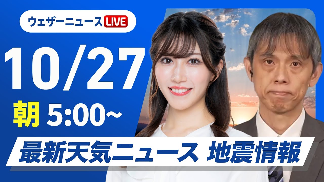 【ライブ】最新天気ニュース・地震情報 2025年10月27日(月) /日本海側は荒天のおそれ 東海から西日本太平洋側は日差し届く〈ウェザーニュースLiVEモーニング・魚住茉由/芳野達郎〉