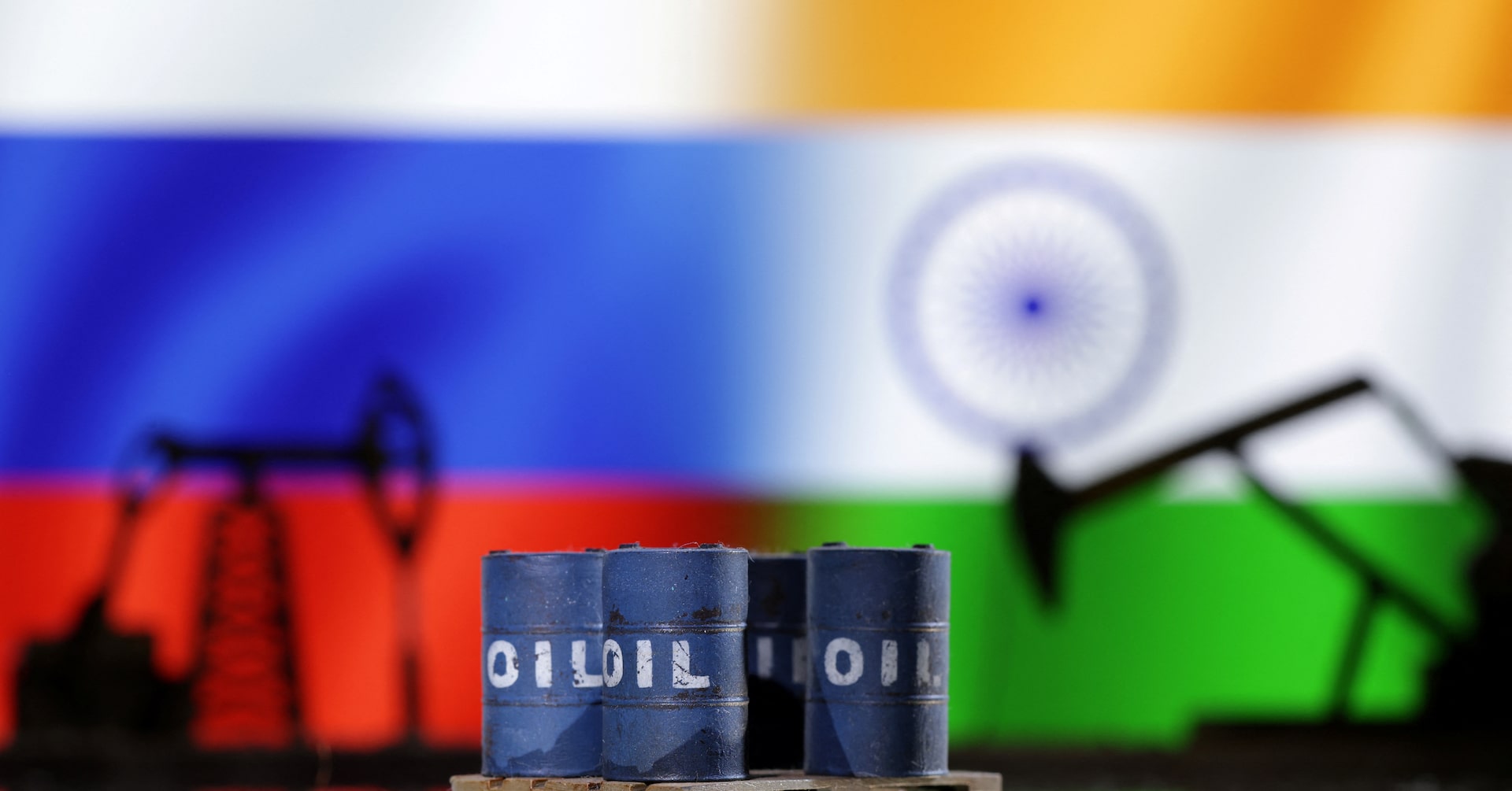 インドの石油精製会社は、ロシア石油大手に対する制裁発表以降、ロシア産原油の新規注文を見送っていると関係筋が28日に明らかにした。写真は、ロシアとインドの国旗、原油ポンプを使ったイメージ。2022年12月、ボスニア・ヘルツェゴビナのゼニカ市で撮影(2025年 ロイター/Dado Ruvic)