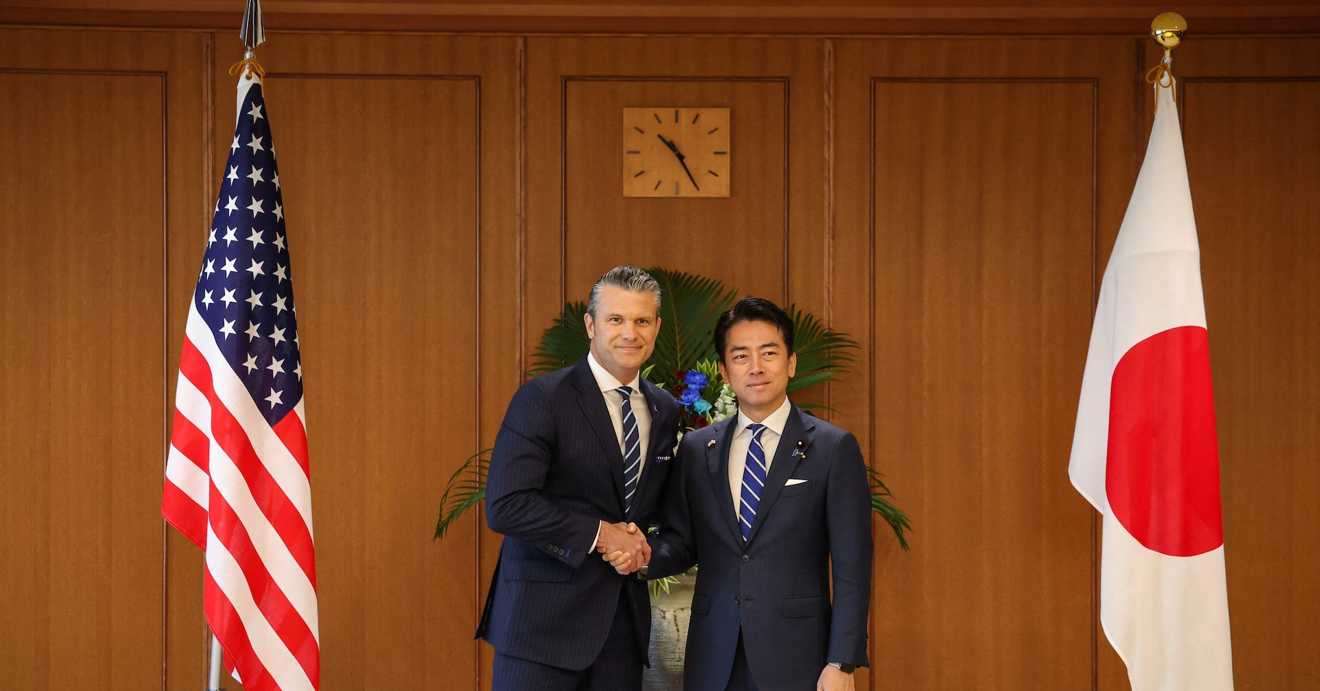 10月29日、来日中のヘグセス米国防長官(写真左)は、高市早苗首相が防衛費を増額する方針を示したことを称賛した上で、できるだけ早期の実施に期待を示した。同日、東京で代表撮影(2025年 ロイター)