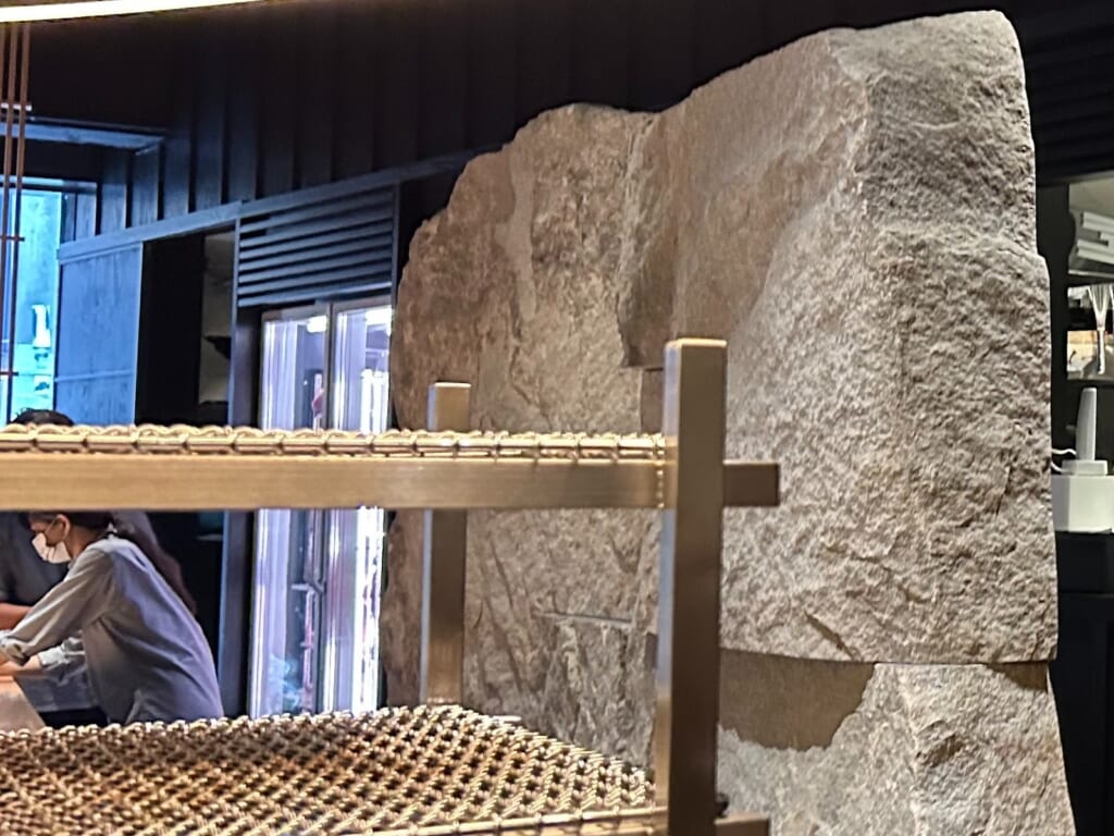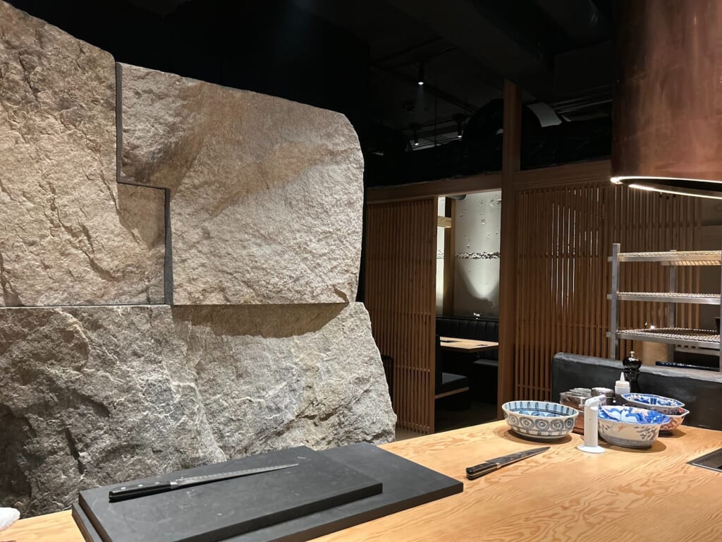 入り口の足元には、香川県産の庵治石がさりげなく配置され、店内カウンターの目の前にも同じ石が使われています。思わず、「すごい!」と言葉が出てしまうほど圧倒的な存在感です。
