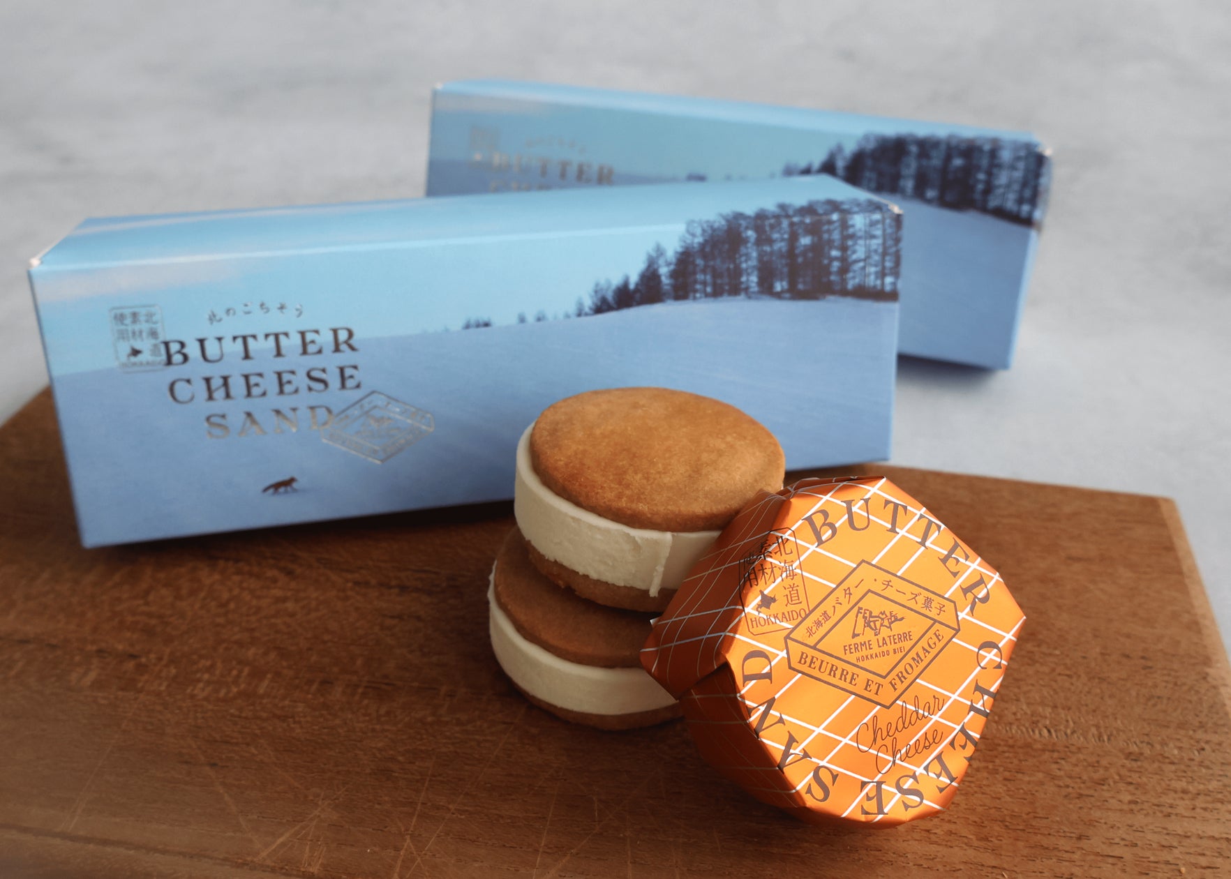 北海道の素材のおいしさを生かしておつくりした新千歳空港限定味「チェダーチーズ」のバターチーズサンド。北海道美瑛小麦を使ったサクホロのサブレで、北海道バターとチェダーチーズを合せた風味豊かなクリームをサンドしました。