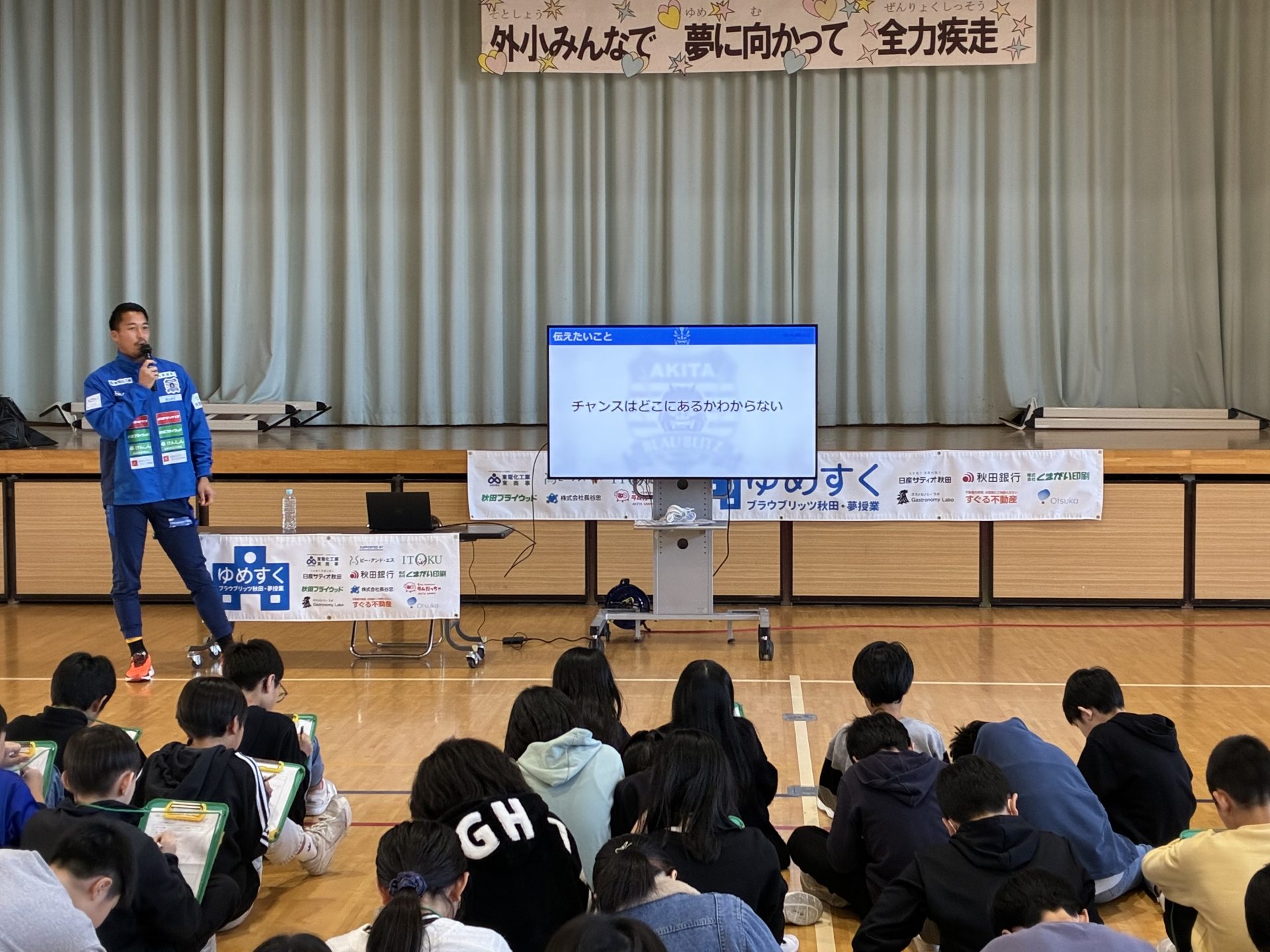 ブラウブリッツ秋田が、ホームタウン活動の一環として実施している「ゆめすく」は、ブラウブリッツ秋田の選手などが学校を訪問し、プロサッカー選手という夢を叶えた経緯を踏まえ「夢を持つことの大切さ」「夢を追いかけることの重要性」を伝える活動です。