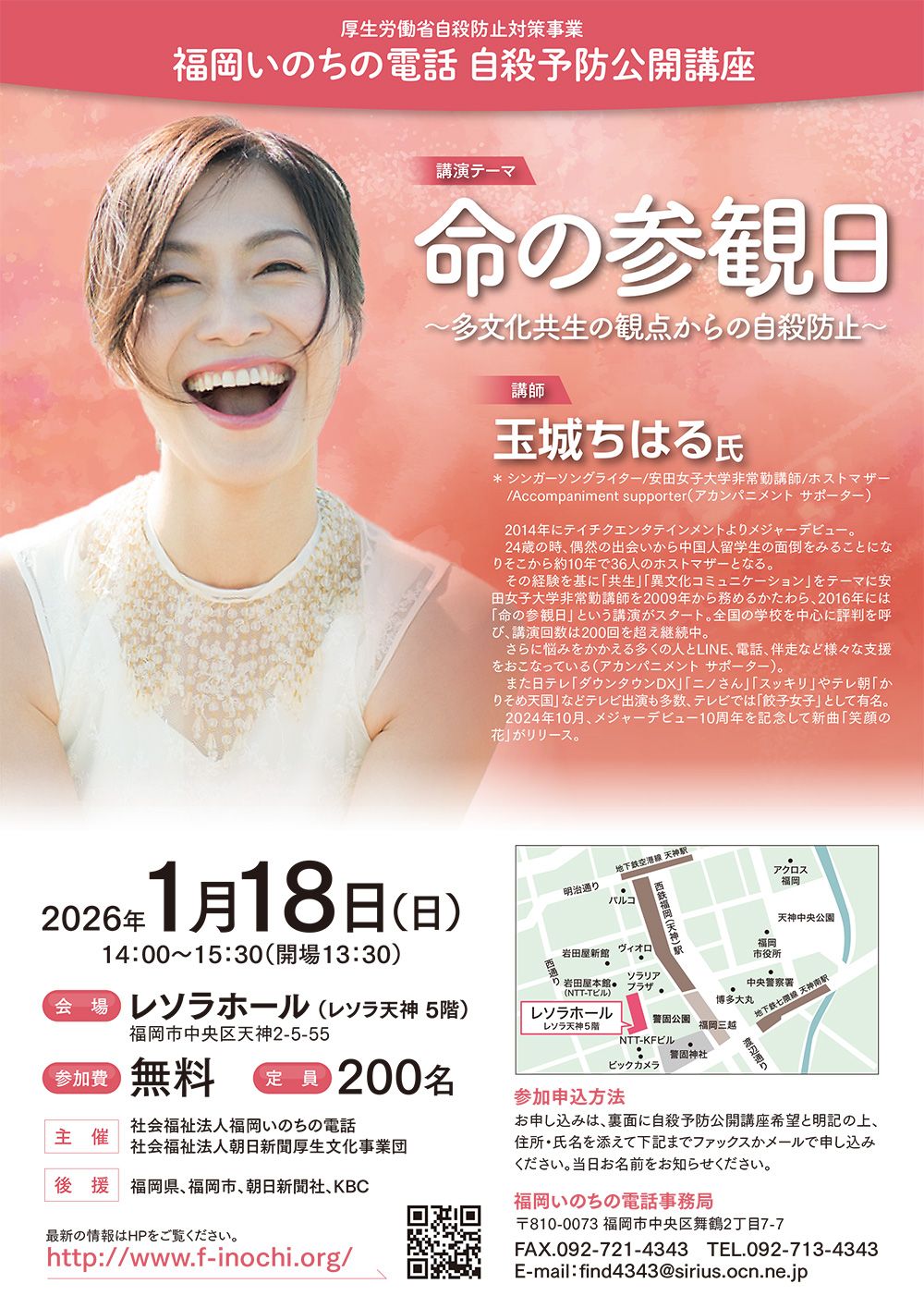 こうした中、今回はシンガーソングライターの玉城ちはるさんを講師としてお招きします。広島出身の玉城さんは18歳のとき、父親を自死で失い、進学を断念した経験をお持ちです。貧困で部屋を借りることができないアジアの留学生らを支援して一緒に暮らす「ホストマザー」活動も長年続けてこられました。講演テーマは「命の参観日~多文化共生の観点からの自殺防止~」。他者を理解し、違いを認め合うことの難しさや大切さを実感してきた玉城さんのメッセージが、いま、生きづらさに苦しむ若い世代らに届けば、と期待しています。