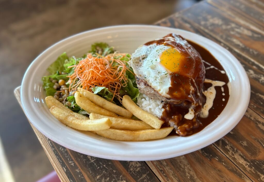 ご飯の上に、ジューシーなハンバーグと目玉焼きがのったボリューム満点のロコモコ。ポテトとサラダがセットになってるのも嬉しいですね!
