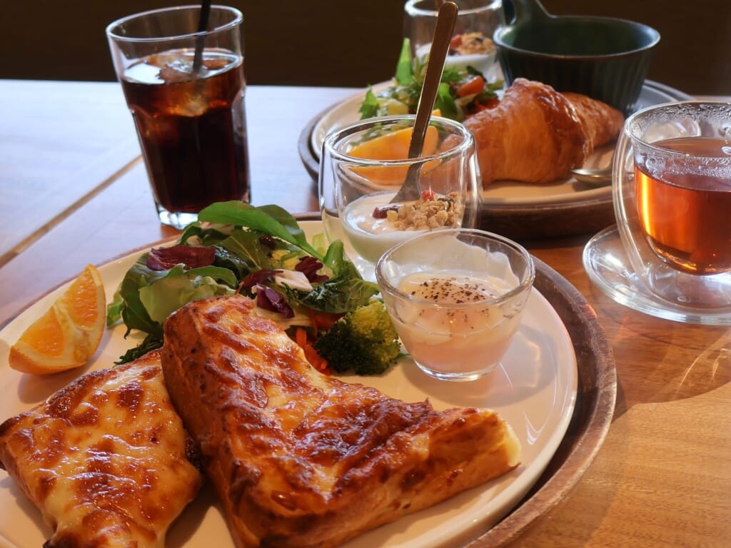 こちらは、クロックムッシュ・サラダ・温泉たまご・グラノーラ入りヨーグルトがワンプレートになったサンドイッチプレート。とろとろのチーズがたっぷりかかっていてチーズ好きにはたまらない逸品です。