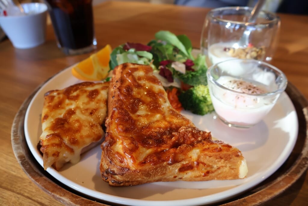 こちらは、クロックムッシュ・サラダ・温泉たまご・グラノーラ入りヨーグルトがワンプレートになったサンドイッチプレート。とろとろのチーズがたっぷりかかっていてチーズ好きにはたまらない逸品です。