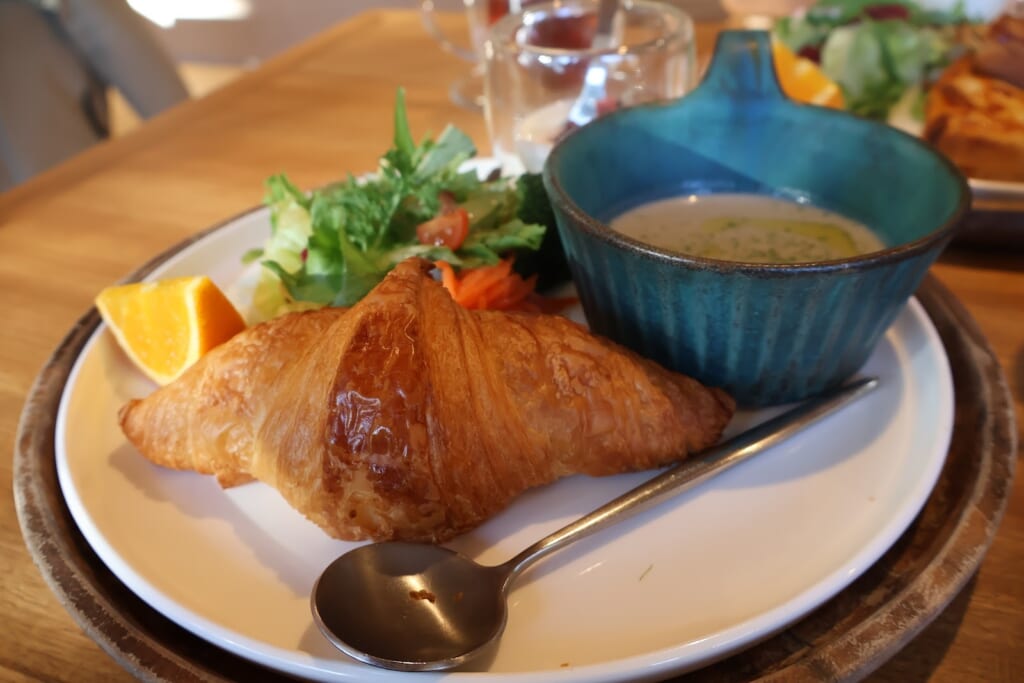 こちらは季節のスーププレート。今回のスープは都城産のごぼうを使用した旨味たっぷりのごぼうスープでしたよ♩セットの焼き立てパンは、窯出しクロワッサンに変更(+100円)していただきました!