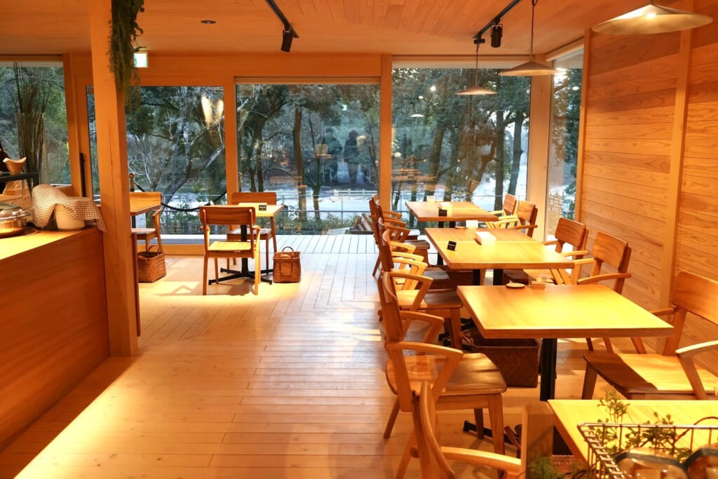 木の温もりを感じる店内。大きな窓からは庄内川の甌穴群が眺められる。