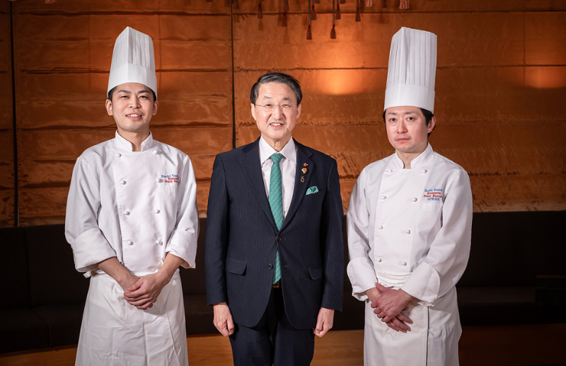 今回の発表会・賞味会には鳥取県知事の平井伸治氏(中)も出席し、鳥取食材の魅力を語った。特別コースを手掛けたブラッスリー ポール・ボキューズ 銀座の鈴木啓太シェフ(右)、大丸東京の山本尚輝シェフ(左)も登壇。