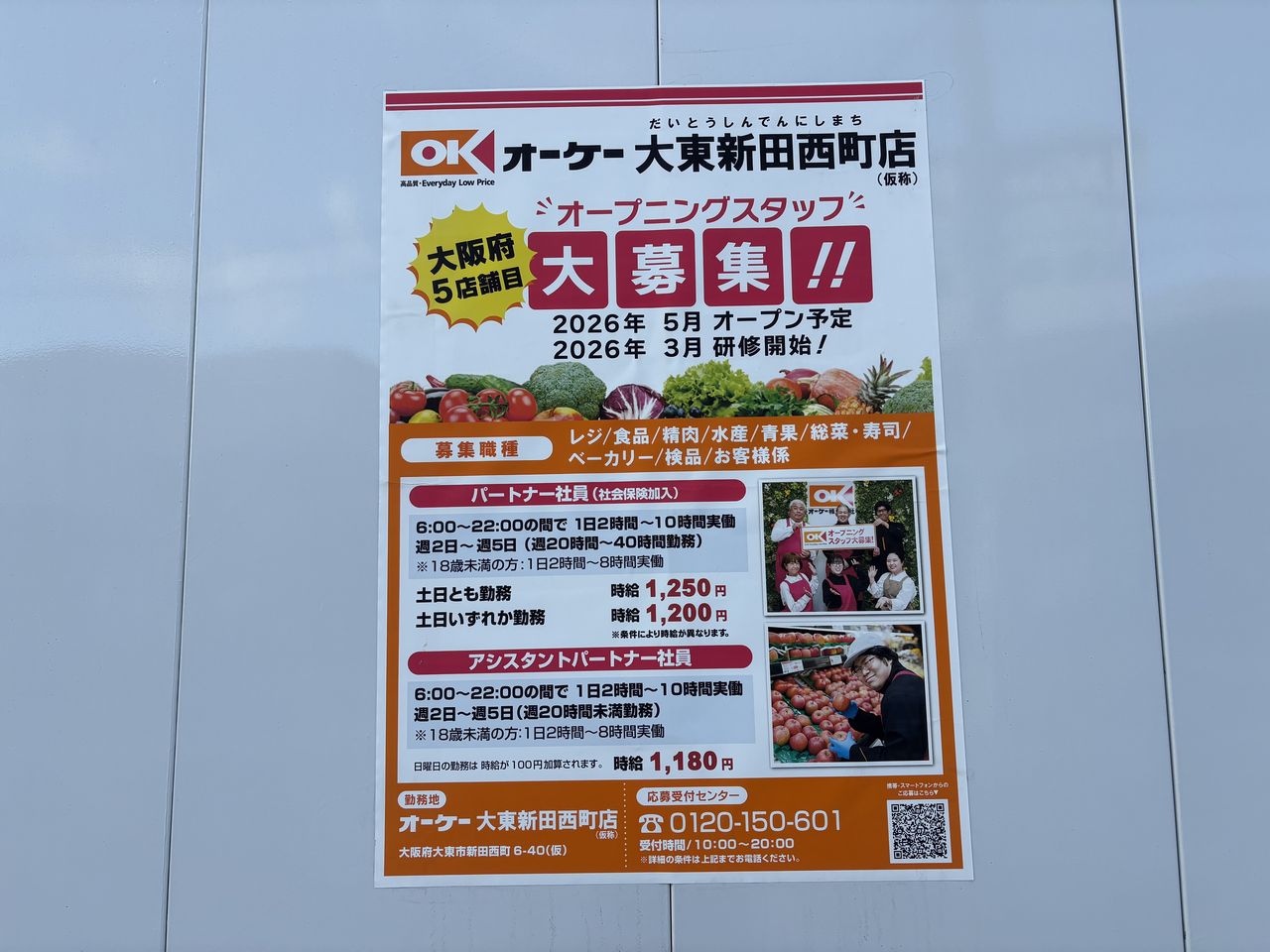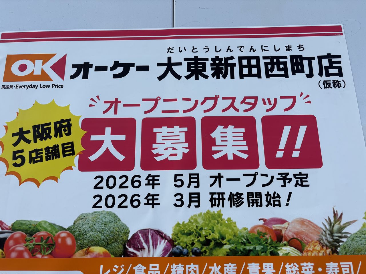 大阪府5店舗目となる「オーケー 大東新田西町店(仮称)」のオープニングスタッフの求人案内ポスターが貼り出されていました。