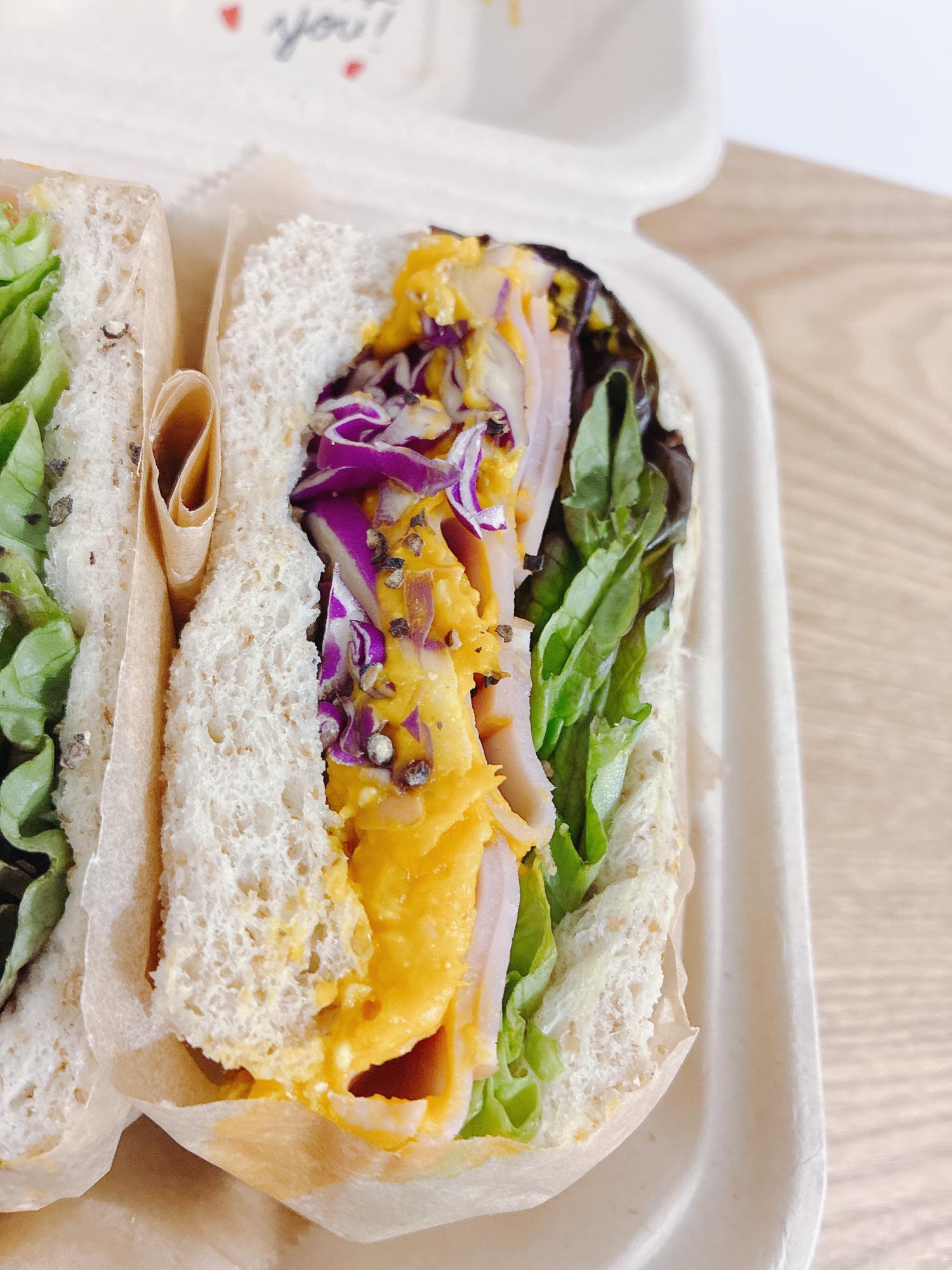 そして見てください、この美しい断面! 香ばしい全粒粉のパンに、鮮やかな黄色のオーガニックかぼちゃペースト、紫キャベツ、レタス、ハムがぎっしりとサンドされています。