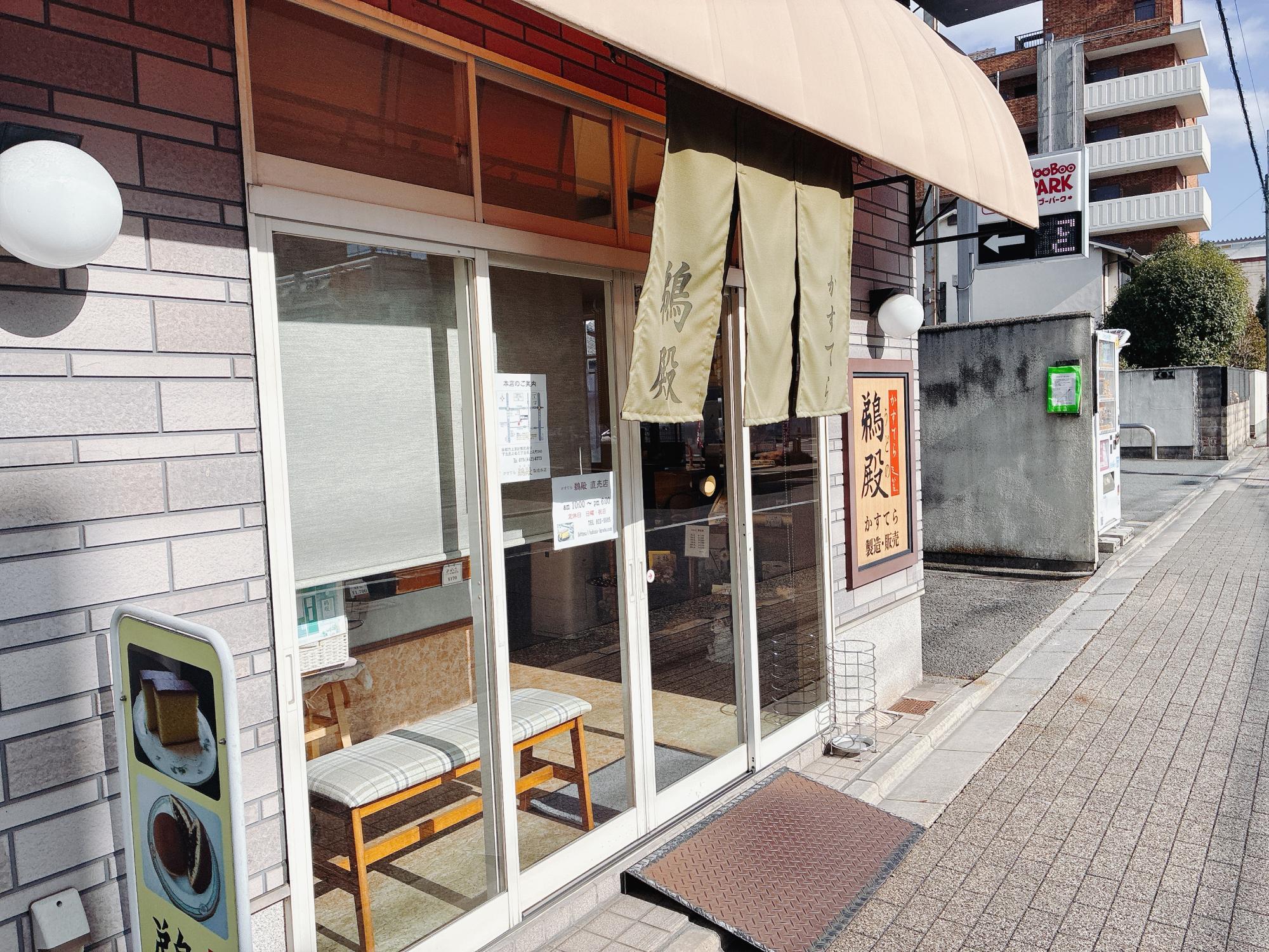 以前、御前通にある製造本店をご紹介しましたが、こちらはその直売店です。住宅街に溶け込むような落ち着いた佇まいで、「かすてら」と書かれた暖簾と木製の看板が目印です。