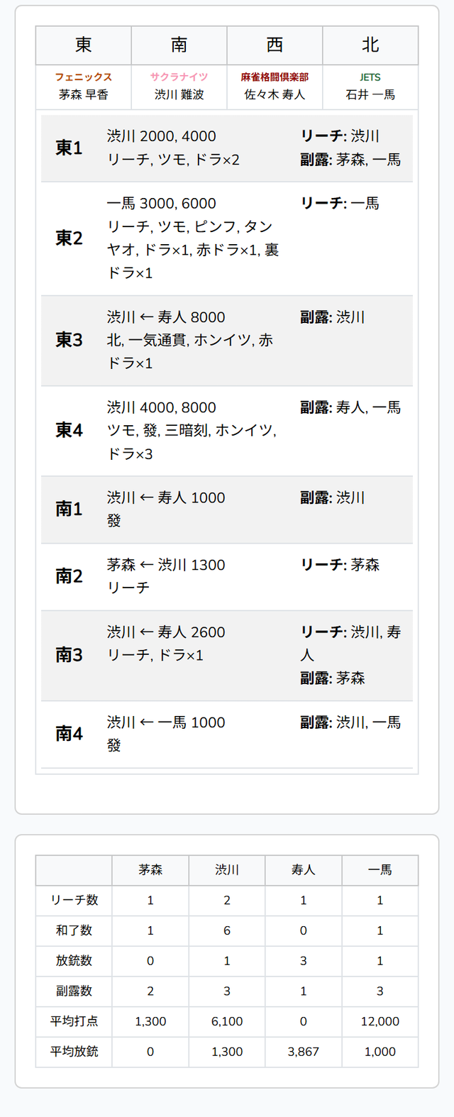 の変則三面張をダマテンに構える。終盤になり、親の一馬は形式テンパイを入れる中、渋川がツモアガリ。4000・8000を手にしてリードを広げていく。