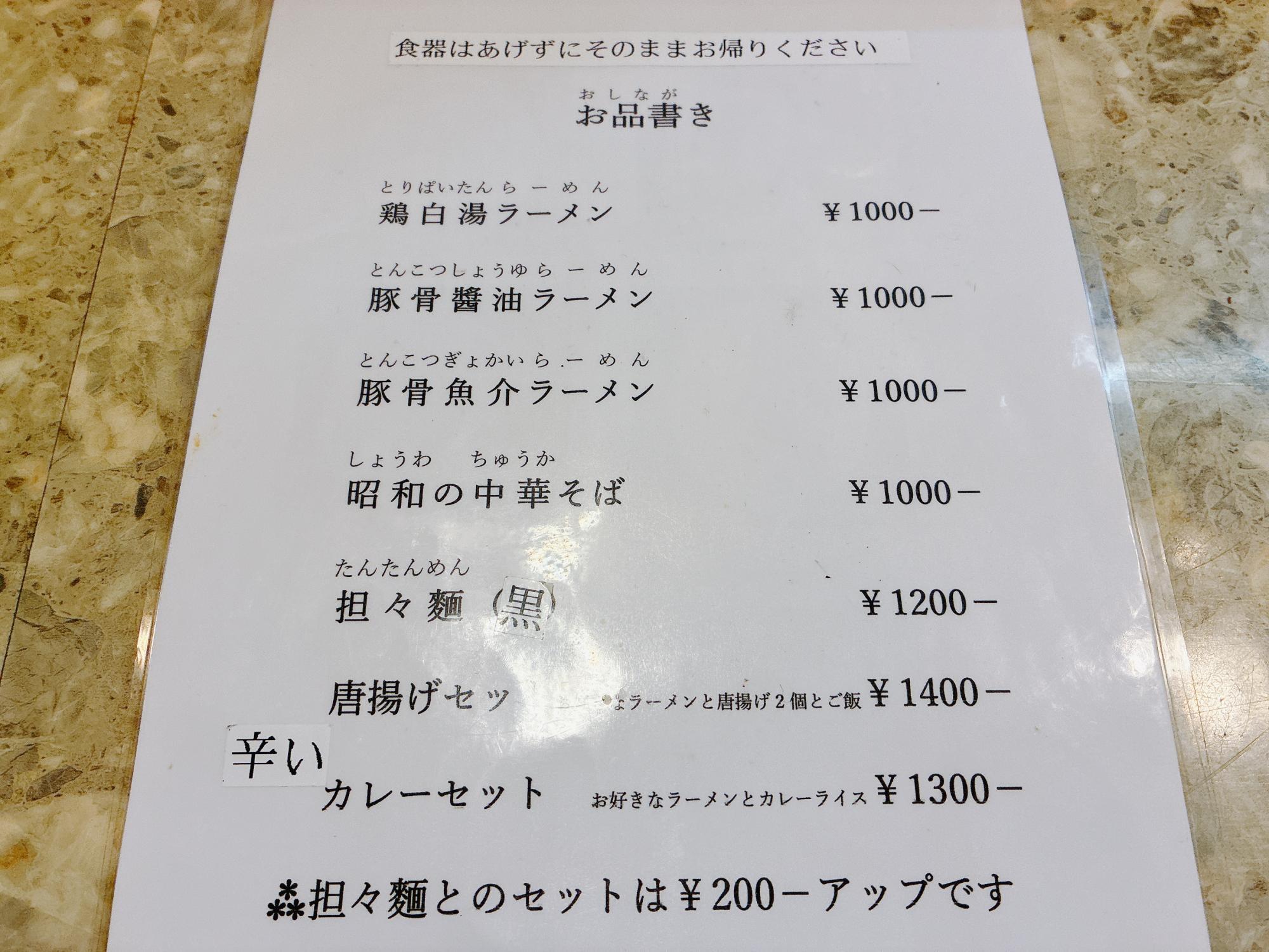 メニューはとてもシンプル。「鶏白湯ラーメン」「豚骨醤油ラーメン」「昭和の中華そば」などがあり、麺類はいずれも1,000円(税込)というわかりやすい価格設定です。