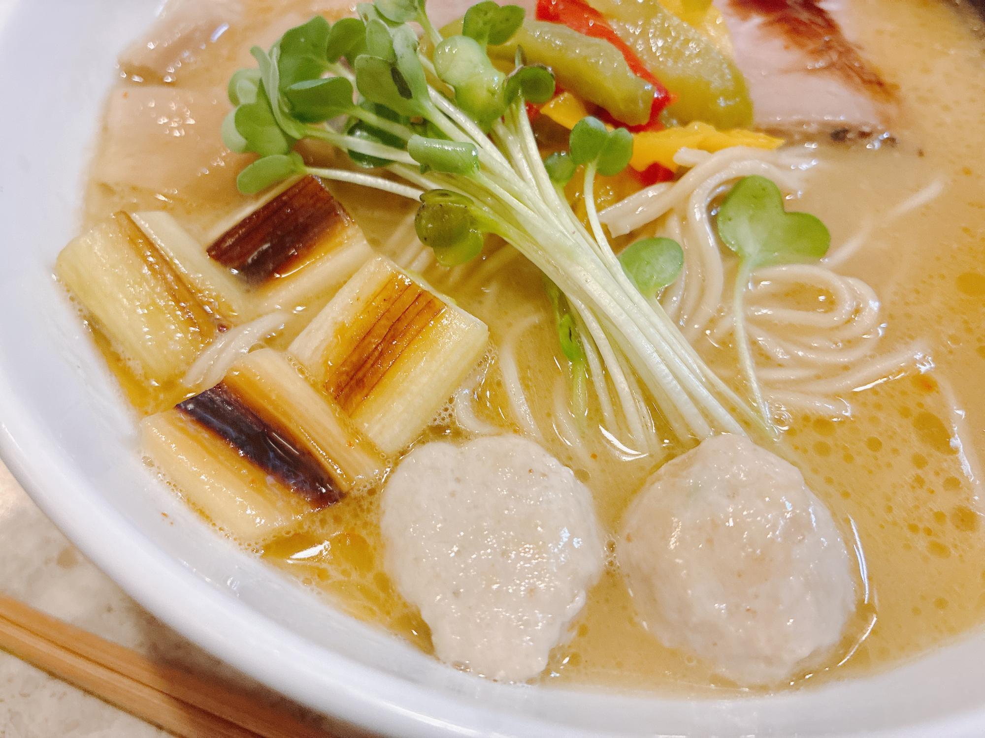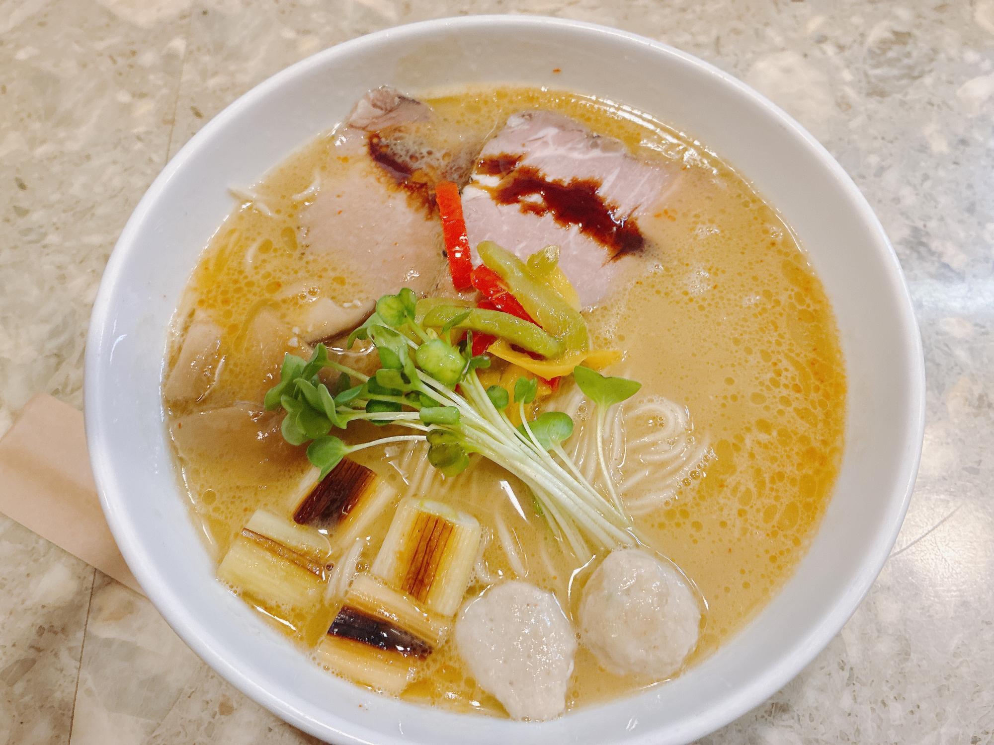 今回は一番人気の鶏白湯ラーメンを注文しました。運ばれてきた瞬間、その美しさに思わず感嘆の声が漏れてしまいました。白濁したスープに、赤や黄色のパプリカ、緑のカイワレ、香ばしく焼かれた白ネギなどがトッピングされ、まるでフレンチの一皿のような彩りです。