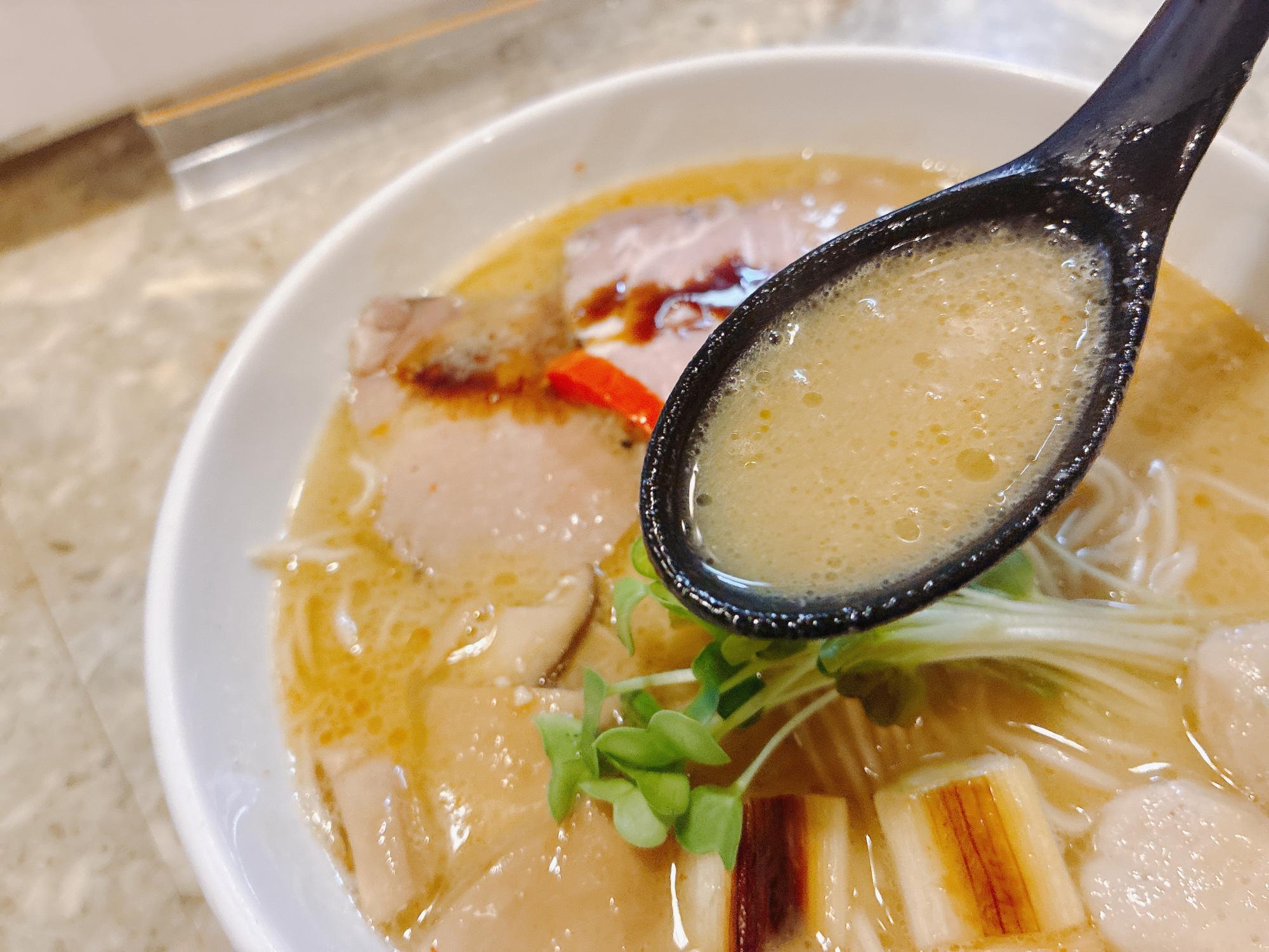 まずはスープをひと口。とろりとした濃厚な口当たりで、鶏の旨味が凝縮されたクリーミーな味わいです。濃厚でありながら臭みは全くなく、まるで上質なポタージュスープを飲んでいるかのよう。仕上げにかかった黒い香味油がアクセントになり、深みのあるおいしさを引き立てています。
