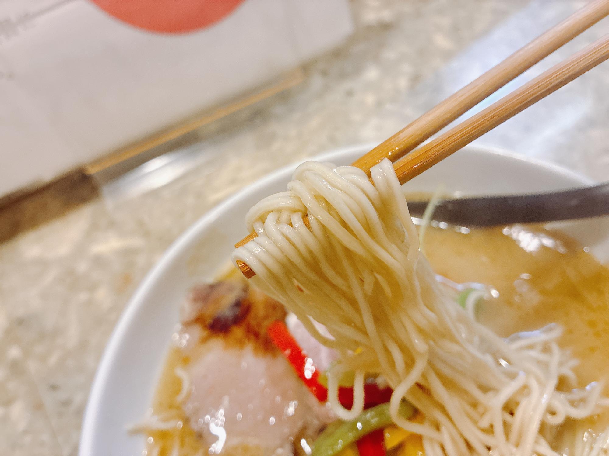 麺は細めのストレート麺。濃厚なスープがしっかりと絡みつき、すするたびに小麦の香りとスープの旨味が口いっぱいに広がります。パツッとした歯切れの良い食感も心地よく、スープとの相性は抜群です。
