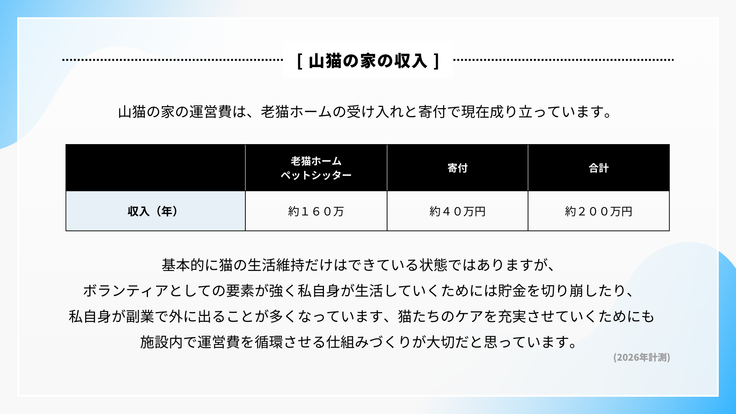 私の運営する保護猫施設『山猫の家』は、築50年の古い建物を使ってこれまで多くの猫たちを保護し、安心できる居場所を提供してきました。さらに近年では、行き場を失った老猫たちを受け入れる”老猫ホーム”としての役割もになっています。