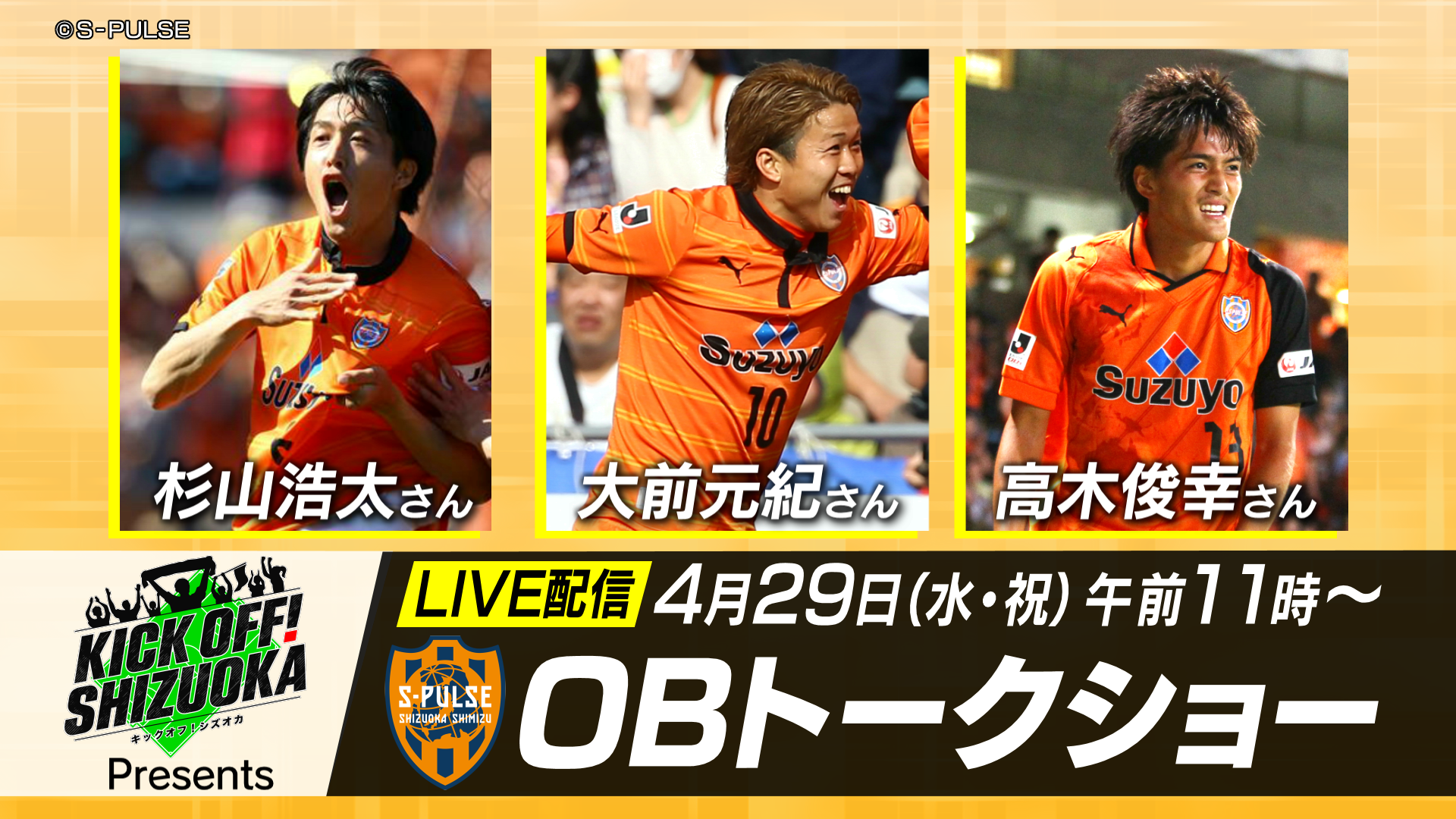 4月29日(水・祝)に行われる明治安田J1百年構想リーグ第13節 長崎戦(10:30開場/13:00キックオフ IAIスタジアム日本平)にて、『KICKOFF!SHIZUOKA presents 杉山浩太×大前元紀×高木俊幸 OBトークショー』として、クラブOBの杉山浩太さん、大前元紀さん、高木俊幸さんがトークショーを行います。