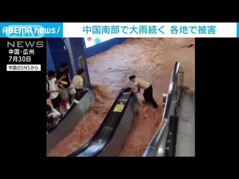 中国南部で大雨が続き地下鉄のホームが濁流にのみ込まれました。