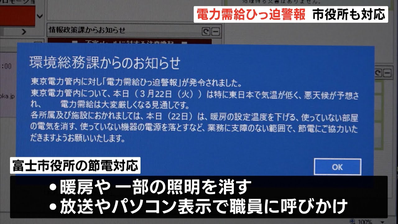 東京電力では3月16日の地震の影響で、火力発電所の一部で運転停止が続き、気温が低いことから電力需給が非常に厳しい状況です。東京電力からの要請を受け、富士市役所では暖房や照明を消すなど節電を行っています。また、庁内放送で職員に呼びかけたほか、パソコンの画面にも節電のメッセージを出しています。