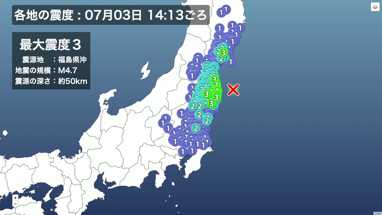 7月3日 14:13 福島県・宮城県で震度3の地震が発生しました。