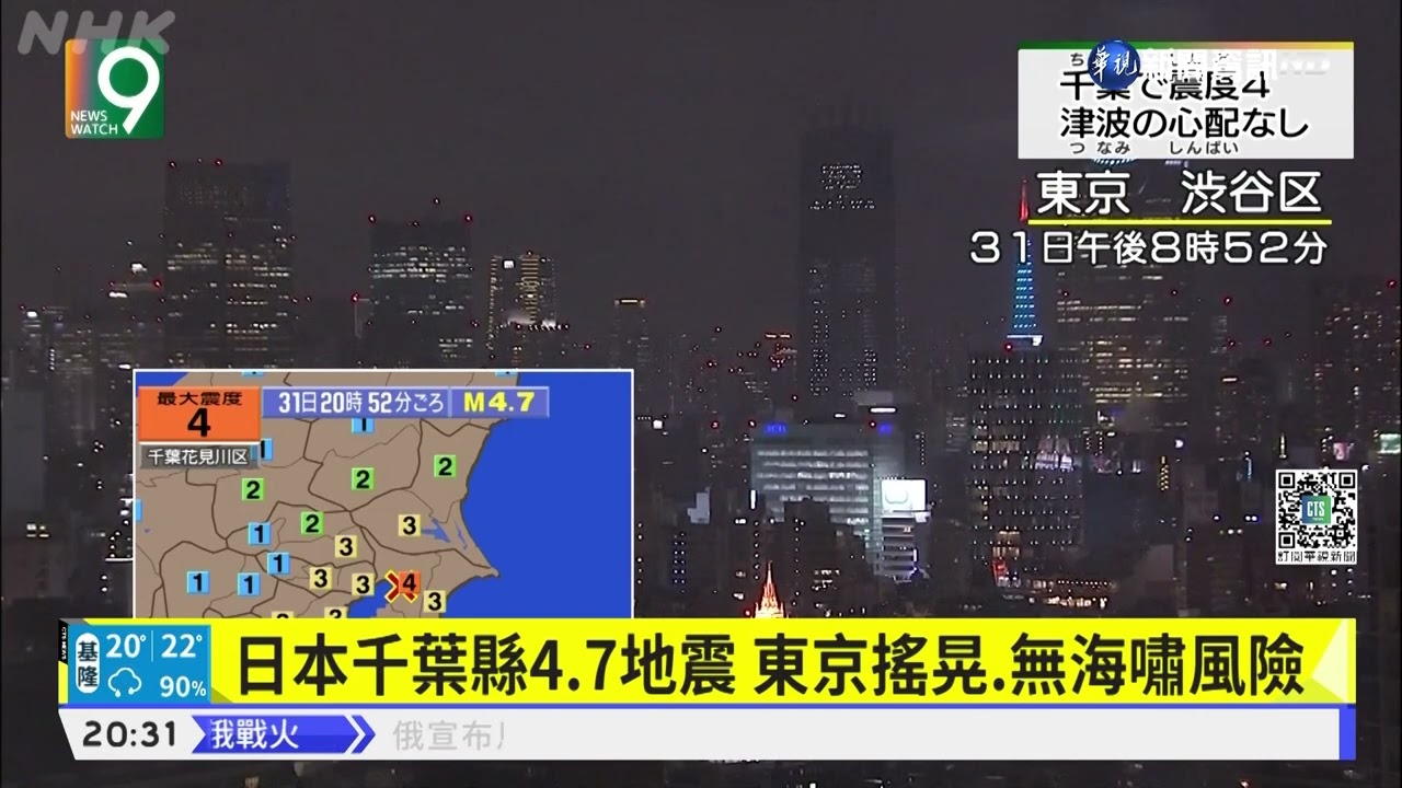 日本千葉縣,在台灣時間今(31)日晚間7點52分,發生規模4.7地震。
