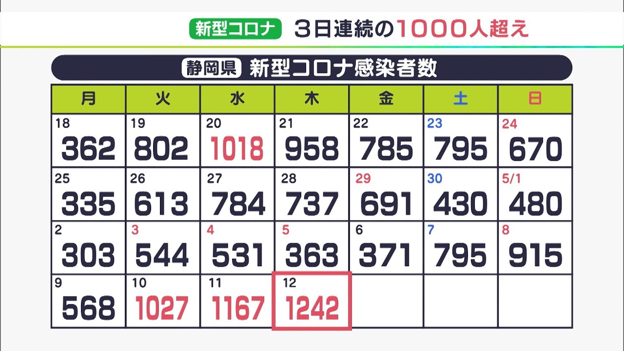静岡県内では5月12日、新たに1242人が新型コロナウイルスに感染したことが分かりました。3日連続で感染者数が1000人を超えています。