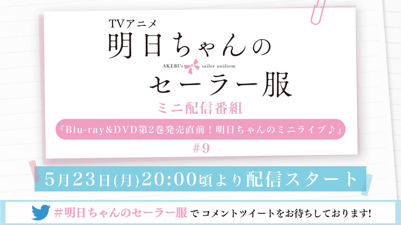 YouTubeライブのチャットおよびTwitterではハッシュタグ「#明日ちゃんのセーラー服」を付けたツイートで、ご感想や番組へのコメント、ご質問などお待ちしております!
