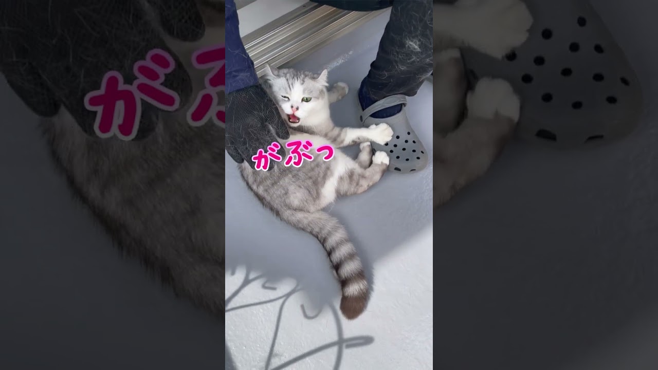 あおちゃんパパさんにブラッシングしてもらっているのに、パパさんに抵抗し噛みついてもパパさんは優しいからあおちゃんをキレイにしてくれてパパさんに感謝だね🐱